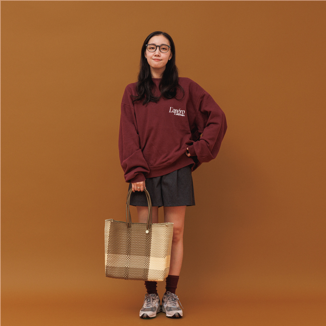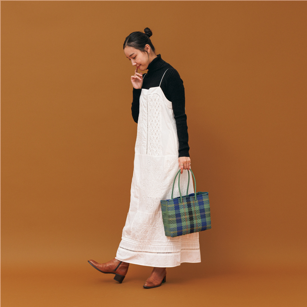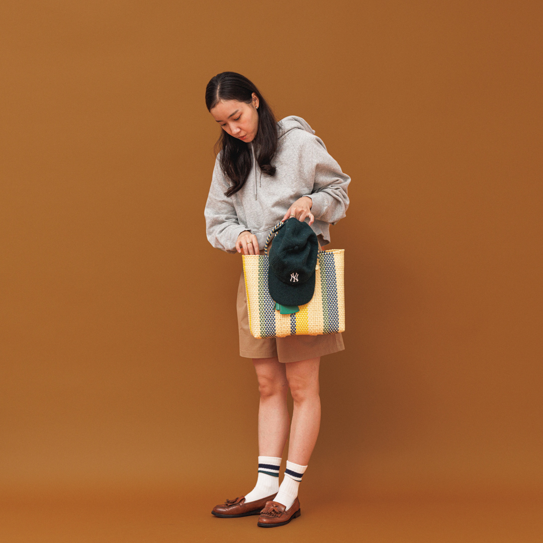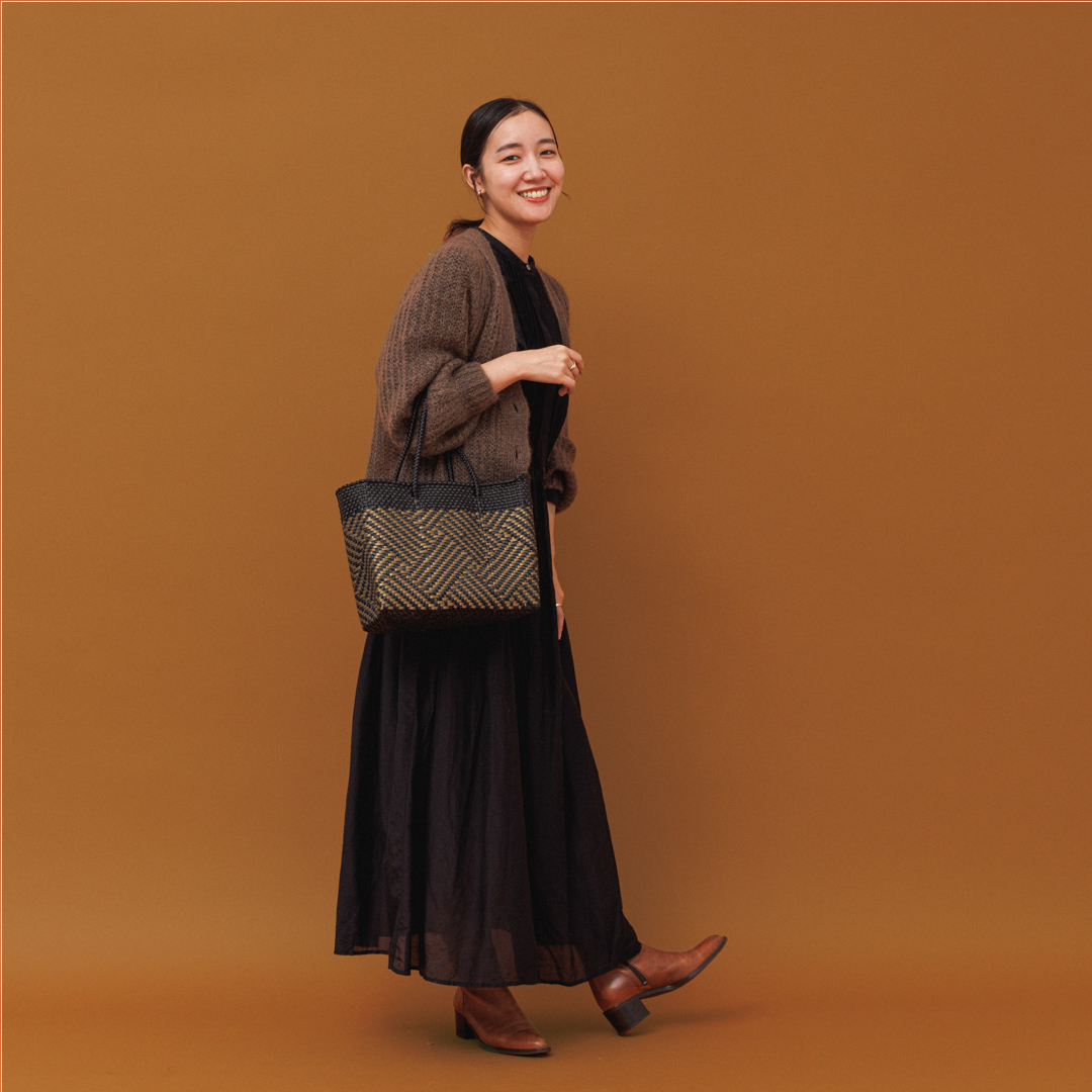 ゴールドのコードを使ったメルカドバッグは品の良い配色がオトナのかごバッグとしてお洒落度をアップ。