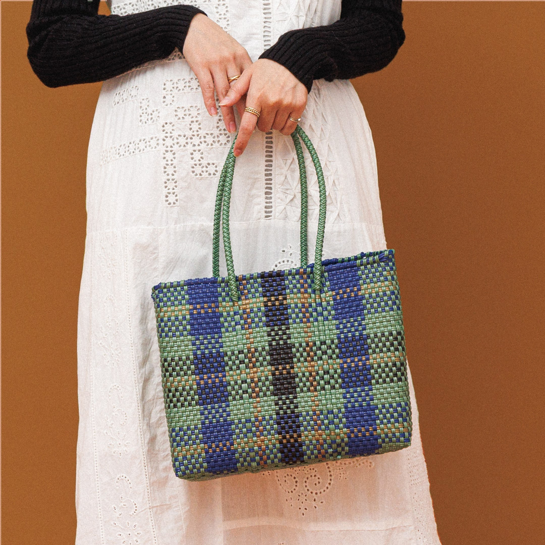 MERCADO BAG - TARTAN CHECK - LONG HANDLE - Metallic Green / Navy / Black (XS)