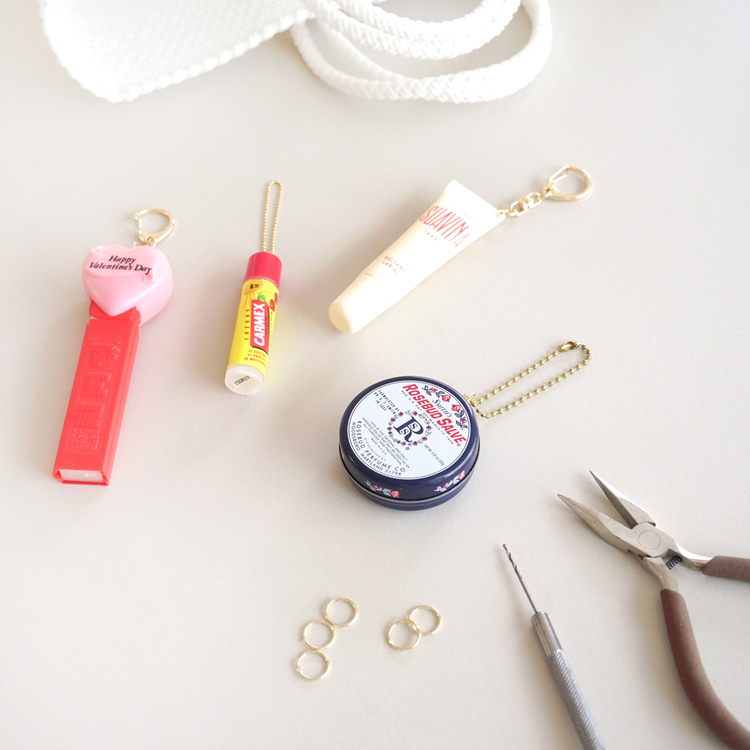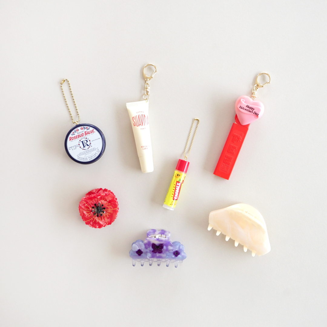 私もお気に入りのリップクリームや、ヴィンテージのPEZをチャームにしてみました。