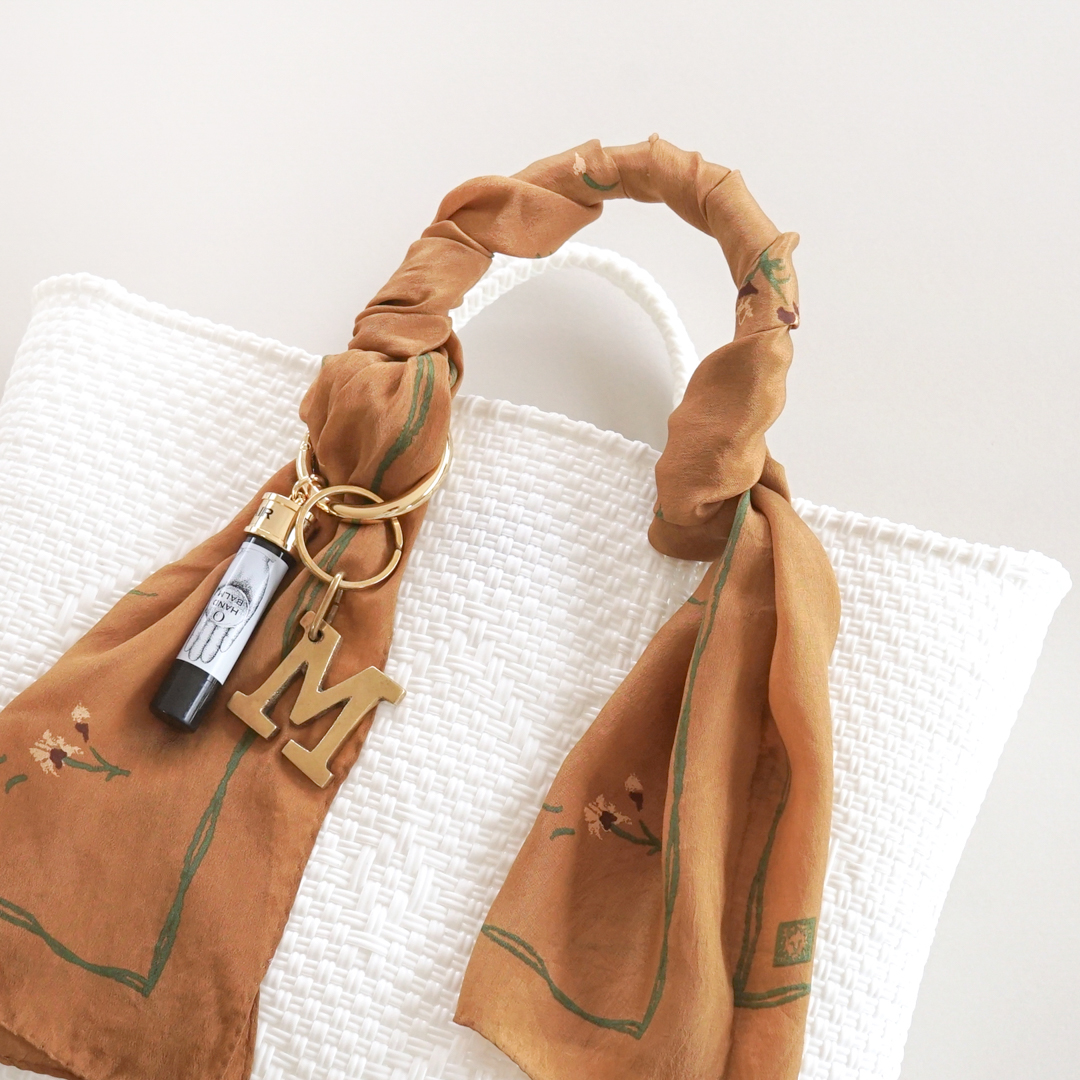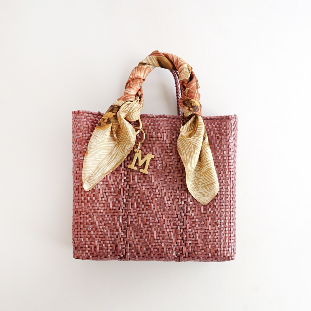 単色のメルカドバッグは、チャームでも柄物のスカーフでも、合わせる小物を選ばないため、アレンジ向きのアイテムです。