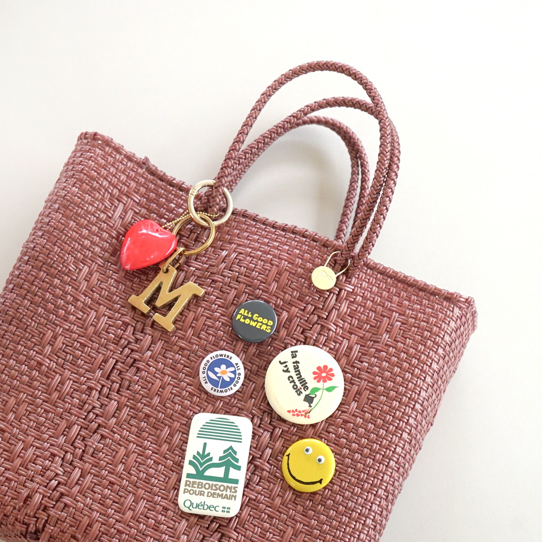 布製のバッグや帽子につけることが多い缶バッジやピンズですが、実はメルカドバッグにも使えるアイテムなんです。