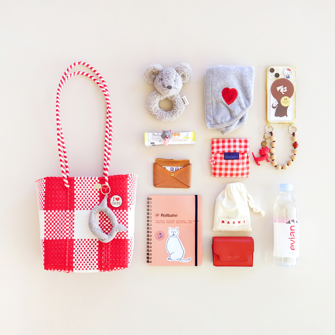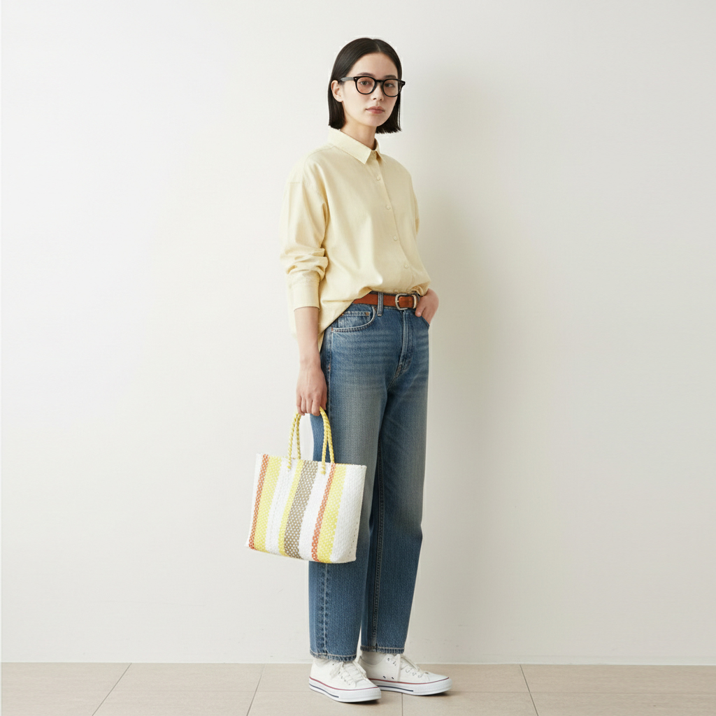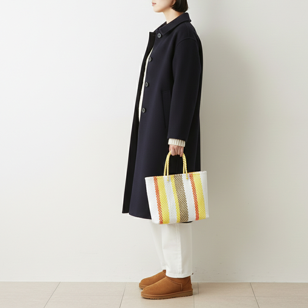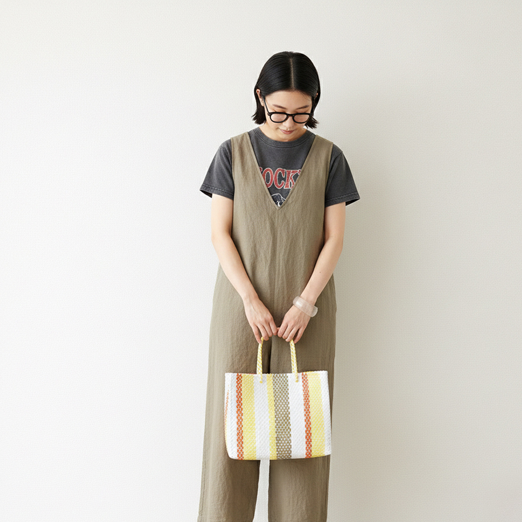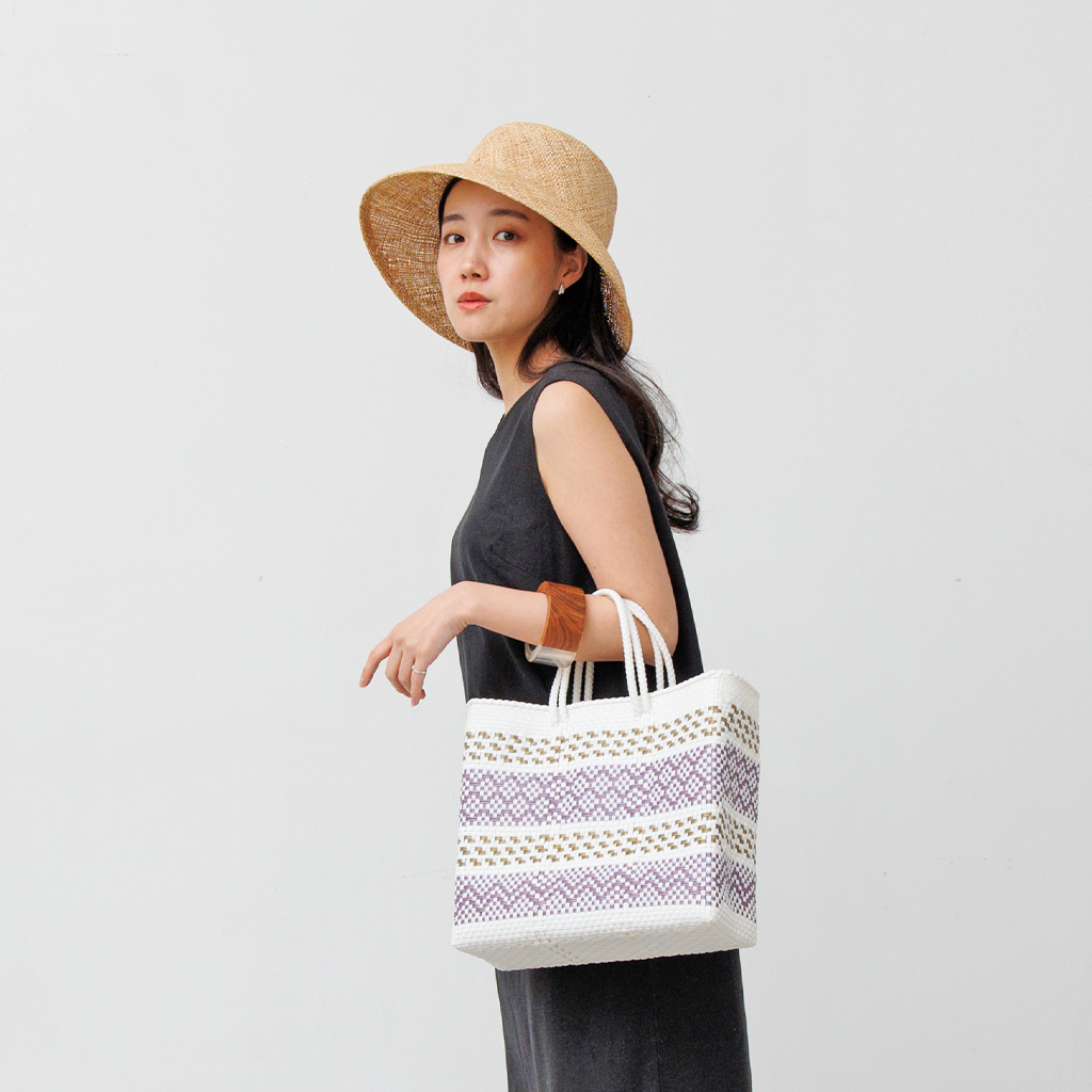 爽やかなホワイトにオレンジやイエロー、ゴールドのストライプが入ったRAYAはトートバッグ感覚で使えるアイテム。